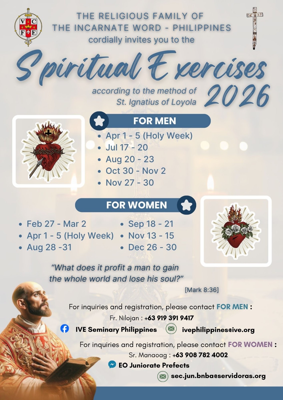 [PHILIPPINES] Spiritual Exercises for women + Añadir Google Calendar Exportación + iCal / Outlook 00 días 00 horas 00 minutos 00 segundos Fecha Abr 01 - 05 2026 Hora 8:00 am - 6:00 pm Localización Filipinas Categoría Filipinas Organizador IVE Filipinas Teléfono +63 939 833 4671 Correo electrónico [email protected] Web http://www.iveph.org/ Compartir este evento